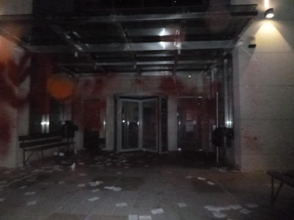 We dedicate our action to the persecuted comrades of the Matrozos 45 Squat who are threatened with 6.5 years in prison. No imprisonment of squatters and anarchists will go unanswered.