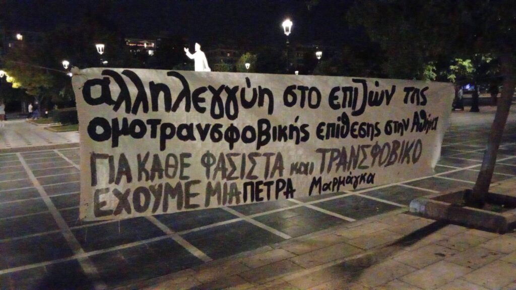 The racism and heterosexism of Greek society directs hatred at queers, immigrants and anyone left over from its heteronormative ethnic body. In a society with widespread transphobia, fascists and homophobes find space to attack in public, with the convenient silence of those around them becoming consent.