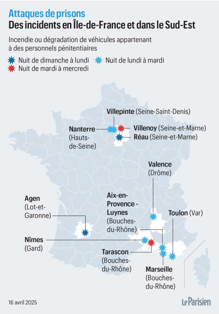 These attacks take place in a particularly tense context, within overcrowded establishments (with an average overcrowding rate of 130%, which can exceed 200% in several prisons), where prison guards are regularly the targets of threats or assaults. Just under a month ago, on Friday March 21, at around 9:30 p.m., three personal vehicles belonging to prison guards at the Gradignan (Gironde) prison on the outskirts of Bordeaux were set alight with Molotov cocktails. The timing of the attack was perfect: at the time, the guards were all gathered to take part in the staff association bingo. The fact that there was a fire or shots fired doesn’t surprise us that much,” says Ronan Roudaut, UFAP-UNSA union delegate at Gradignan prison. “But it’s the fact that these actions are being coordinated on a national level that’s unexpected.”