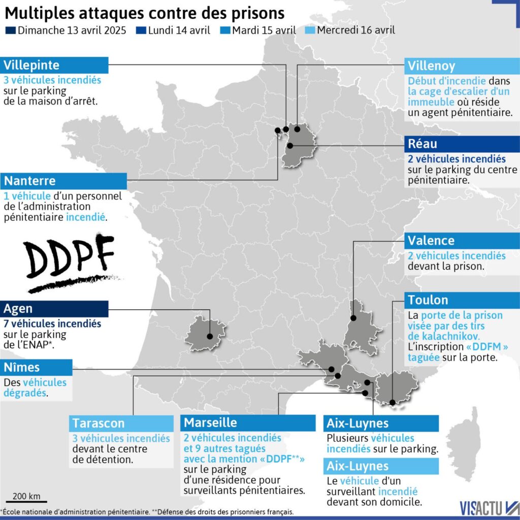 Lastly, in a lengthy interview with France info (17/4), the national anti-terrorist prosecutor, Olivier Christen, gave his own account of the attacks: he reported “12 incidents, two against the personal homes of prison officers, one against vehicles in the parking lots of the École nationale pénitentiaire (Enap) and nine directly against prisons”. Geographically, “eight départements were affected”, including “a third of the incidents committed in the Bouches-du-Rhône and a third in the Île-de-France region”, with a total of “21 vehicles torched and a dozen vehicles damaged” (not to mention the machine-gunning of the Toulon prison gate and the burning of the ERIS prison gate in Aix-Luynes). In conclusion, this fanatical defender of state terrorism and fervent supporter of armored propaganda, even added a layer of conspiracy theorizing of which he has a secret: “It could be groups of politically radicalized people, it could be groups more linked to organized crime, it could also be a convergence of objectives and people manipulating each other: anything is possible”.