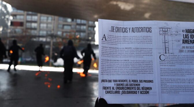 A speech was read in the middle of the confrontation before the spectators of the action and students who happened to be there; meanwhile, an edition entitled “Make Ideas a Real Threat” was handed out. This print publication was made that month by the self-named “cooperative of antagonists”, and is an invitation to reflect on the prison system. As mentioned at the time, far from wanting to line the masses up to wait forever behind a desk of the famous power of the people, it proposes nourishing and building anarchist struggle from permanent tension and conflict against power.