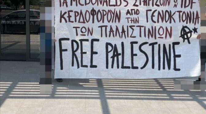 In the same context, we see Israel’s attempt to completely dehumanize the Palestinians. For this reason, we must highlight the destructive death policies of the colonial monster Israel and target the investment cooperation of Israeli-Greek capital, especially when it reaches our cities, and in the case of Thessaloniki mainly through the tourism and real estate industries. This will only be possible if we extend the pressure exerted by solidarity demonstrations and other solidarity actions of all kinds in the struggle of the Palestinians for their lives.