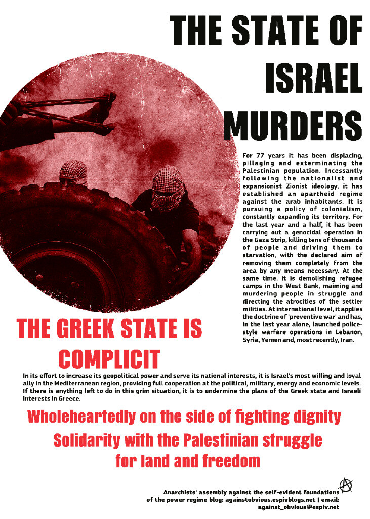 For 77 years it has been displacing, pillaging and exterminating the Palestinian population. Incessantly following the nationalist and expansionist Zionist ideology, it has established an apartheid regime against the arab inhabitants. It is pursuing a policy of colonialism, constantly expanding its territory. For the last year and a half, it has been carrying out a genocidal operation in the Gaza Strip, killing tens of thousands of people and driving them to starvation, with the declared aim of removing them completely from the area by any means necessary. At the same time, it is demolishing refugee camps in the West Bank, maiming and murdering people in struggle and directing the atrocities of the settler militias. At international level, it applies the doctrine of ‘preventive war’ and has, in the last year alone, launched police-style warfare operations in Lebanon, Syria, Yemen and, most recently, Iran.