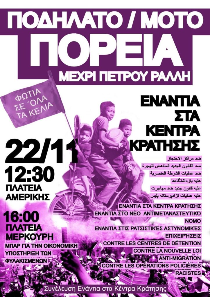 We call everyone to the bicycle / moto-demonstration on 22/11 Against Detention Centres, Plateia Amerikis 12:30 in Athens https://athens.indymedia.org/event/99274/