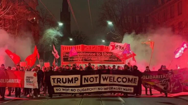 19/01, Zurich, Switzerland. On Monday evening, more than two thousand people took to the streets of Zurich to protest against US President Donald Trump and the World Economic Forum (WEF), the Davos Forum, which is taking place this week in Davos, Switzerland. Demonstrators gathered early in the evening on Bürkliplatz square to protest what they called a “meeting of the oligarchs.” Tensions were high during the march: several buildings were vandalised with spray paint, some containers were set on fire and some shop windows were damaged. Protesters threw firecrackers, smoke bombs and fireworks, and police responded with water cannons, tear gas and rubber bullets. On Sunday, there were also protests in Davos against Trump for his stance on Greenland and the concentration of wealth in the hands of global elites.
